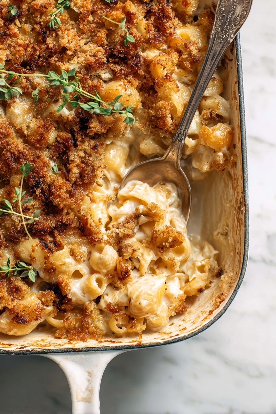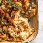 I usually finish this mac and cheese with fresh thyme sprigs because their herbal brightness cuts through the richness beautifully. Sometimes I sprinkle a little extra freshly cracked black pepper on top too, just for a little kick. If I’m serving this to a crowd, popping on a few crunchy fried shallots or fresh chives makes it even more special.