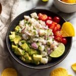 This ceviche is really best served immediately after mixing because the fish continues to “cook” in citrus juice. If you need to prep ahead, cut all the veggies and fish, but combine just before serving. Leftovers aren’t recommended due to texture and food safety concerns.