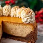 - Decorate and Serve: Pipe whipped cream around cheesecake edge and garnish with gingerbread men cookies if desired. Slice and enjoy!