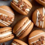 These Gingerbread Macarons combine classic French pastry finesse with festive gingerbread spices and flavors. Delicate almond meringue shells are infused with cinnamon, ginger, and cloves, then paired with a rich molasses buttercream for a perfect holiday treat. The optional white chocolate drizzle and gingerbread men sprinkles add a fun decorative touch, making these macarons an elegant and delicious dessert for the holidays or any special occasion.