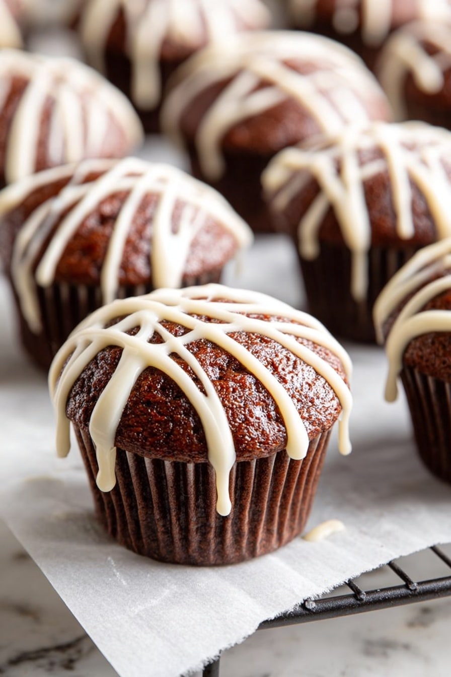 A group of brown muffins with a soft, moist texture are shown on a silver cooling rack placed over a white marbled surface. Each muffin has white icing drizzled in thin, even lines on top. One muffin in the front has a large bite taken out, revealing its dense crumb inside. There is a close-up detail of the crumb texture along with a few crumbs scattered on the marbled background. Photo taken with an iphone --ar 2:3 --v 7 - Gingerbread Muffins with Vanilla Glaze, cozy gingerbread muffins, spiced muffin recipes, holiday breakfast treats, moist gingerbread muffins