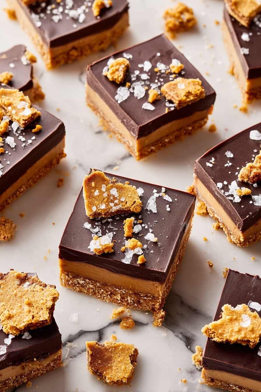 Once your caramel has set, it’s showtime for the chocolate layer. Melt your chopped dark chocolate in a microwave-safe bowl in 30-second bursts, stirring between each round, until smooth and fully melted—this usually takes me about 1 and a half minutes total. Pour the melted chocolate evenly over the caramel and use the back of a spoon or an offset spatula to spread it into a sleek, even layer. Now, sprinkle the crushed gingersnaps on top—they add that extra texture and a punch of gingerbread feel. If you’re feeling fancy, a light dusting of flaky sea salt takes these bars to the next level by balancing sweetness. Pop your pan into the fridge and chill until the chocolate is fully set, about 2 hours. To serve, use the parchment overhang to lift the entire slab from the pan, place on a cutting board, and slice into squares with a sharp knife. Clean your knife between cuts for cleaner edges—this little step always helps me present bars that look just as good as they taste.