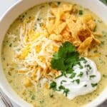 This Green Enchilada Chicken Soup is a comforting and flavorful slow cooker recipe combining tender chicken, white beans, creamy cheese, and vibrant green enchilada sauce. Perfect for a hearty meal, it is topped with tortilla strips, cheddar cheese, sour cream, avocado, and fresh cilantro for a delicious Tex-Mex twist.