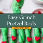 These festive Grinch Pretzel Rods combine salty pretzels, chewy caramel, and creamy green-tinted white chocolate for a delightful holiday treat. Finished with green sugar sprinkles and candy hearts, they make a fun and colorful snack perfect for holiday parties or gifting.