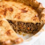 This Ground Beef Meat Pie recipe offers a savory and hearty filling of seasoned ground beef, grated potatoes and carrots, all encased in a buttery double crust. Perfectly baked to a golden brown, this classic comfort food makes a delicious meal that can be enjoyed warm and is ideal for make-ahead and freezer-friendly preparations.