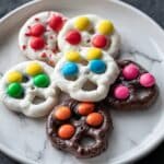 Reheating isn’t typically necessary since these are cold treats, but if your candy melts soften a bit, just pop the pretzels in the fridge for a few minutes to firm back up. Avoid microwaving, as that can make the pretzels soggy or cause the candy to melt unevenly.