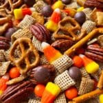 A festive and flavorful Halloween Pumpkin Spiced Chex Mix, featuring a crunchy blend of Chex cereal, pretzels, Bugles, and pecans coated in a sweet pumpkin spice glaze, finished with seasonal candy corn and Reese’s Pieces for a perfect fall snack.
