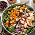 This Harvest Chicken Salad with Maple Dijon Dressing is a delightful combination of tender roasted sweet potatoes, juicy pan-seared chicken, fresh spinach, crisp apples, dried cranberries, and toasted nuts, all tossed in a creamy and tangy maple dijon dressing. Perfect for a nutritious and flavorful autumn-inspired meal.