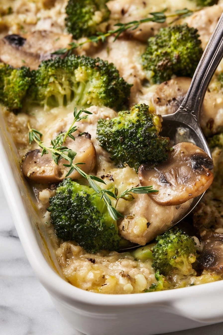 Add the cooked rice or thawed cauliflower rice to the casserole dish with the chicken and broccoli. Pour the luscious mushroom sauce over everything, folding it carefully until all ingredients are evenly coated. Spread the mixture out evenly, and pop it into your preheated oven. Bake uncovered for 20 minutes, until you see bubbly edges and a slight golden tint on top. Once out of the oven, let it rest for 5–10 minutes—this helps the casserole set and makes it easier to serve.