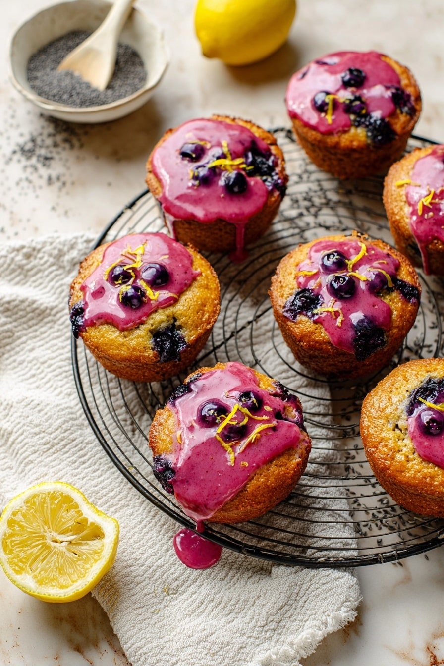 Once your muffins have cooled completely (trust me, this is key), mix together powdered sugar, lemon zest, blueberry jam, and lemon juice in a small bowl. Adjust lemon juice quantity to get the right glaze consistency—it should be thick enough to coat but runny enough to drizzle. I like dipping the muffin tops right into the glaze, letting the extra drip off, and then placing them on a wire rack with parchment underneath to catch drips. It creates such a sweet and tangy finish without going overboard.