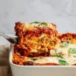 - Bake the Lasagna: Cover the assembled lasagna tightly with foil and bake for 25 minutes. Remove the foil and bake uncovered for an additional 20 minutes. For a bubbly and golden top, broil on high for 2 minutes or until the mozzarella turns a golden brown. Remove from oven and garnish with ¼ cup grated parmesan cheese and fresh basil leaves. Let the lasagna rest and cool for 15-20 minutes before slicing and serving to allow it to set.