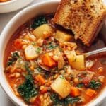 - Serve: Ladle the soup into bowls and top with a drizzle of olive oil and a sprinkle of vegan parmesan cheese if using. Serve alongside garlic bread or focaccia for a complete meal.