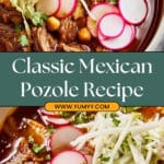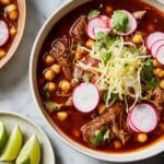 The traditional garnishes include thinly sliced radishes, shredded cabbage, fresh cilantro, and lime wedges. You can also add chopped onion, avocado slices, shredded cheese, or crispy tortilla strips—whatever you love that adds brightness and texture contrasts to this hearty stew.