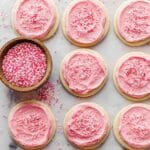 - Frost and decorate: Once the cookies have cooled completely, generously frost them with the prepared frosting and sprinkle the top with colored sprinkles for a festive finish.