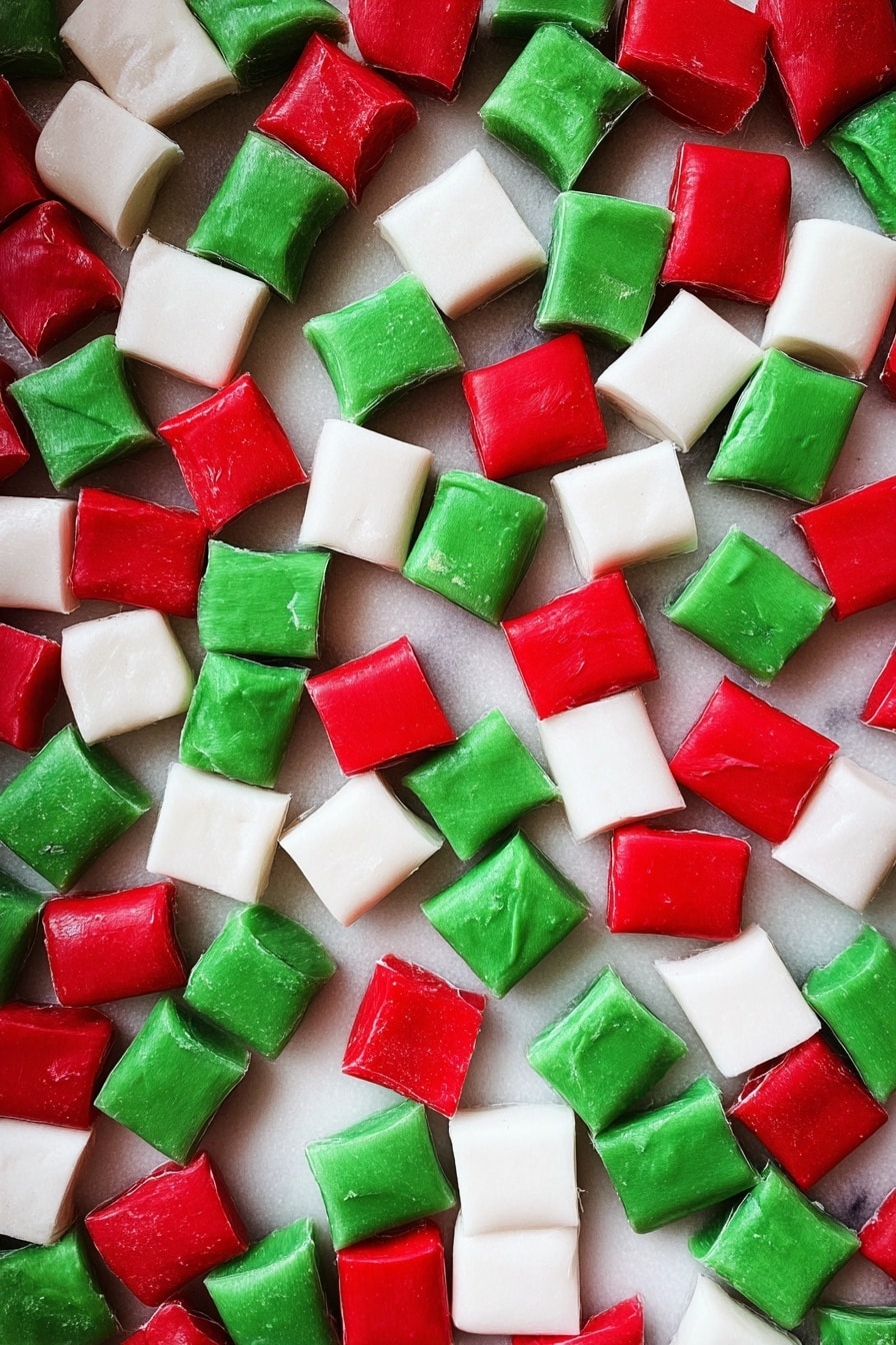 The image shows a black baking tray lined with parchment paper, arranged with three rows of small, pillow-shaped dough pieces. The top row is bright green, the middle row is vivid red, and the bottom two rows are white. Each dough piece is smooth and slightly shiny, evenly spaced on the tray. The tray sits on a white marbled surface with natural light enhancing the colors and textures, giving a neat and colorful look. photo taken with an iphone --ar 2:3 --v 7 - Homemade Peppermint Butter Mints, peppermint candies, homemade holiday candies, mint recipes, easy peppermint mints