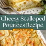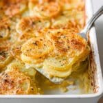 This homemade scalloped potatoes recipe features tender Yukon Gold potatoes layered with a creamy garlic and onion milk sauce, sharp cheddar, and Parmesan cheese. Baked to golden bubbly perfection, it’s a comforting classic side dish perfect for any occasion.