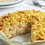This Hot Chicken Salad Pie is a comforting and delicious dish featuring a flaky deep dish pie shell filled with a creamy mixture of shredded chicken, fresh vegetables, cheddar cheese, and crunchy pecans. Topped with crushed sour cream and onion potato chips, it bakes until bubbly and golden, making it perfect for a hearty meal or gathering.