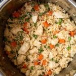 - Finish and Stir: Remove the cooked chicken breasts onto a cutting board and let them rest for a few minutes. Chop the chicken into bite-sized pieces and stir it back into the rice mixture in the pot. Add the cooked frozen peas and mix well to incorporate evenly.