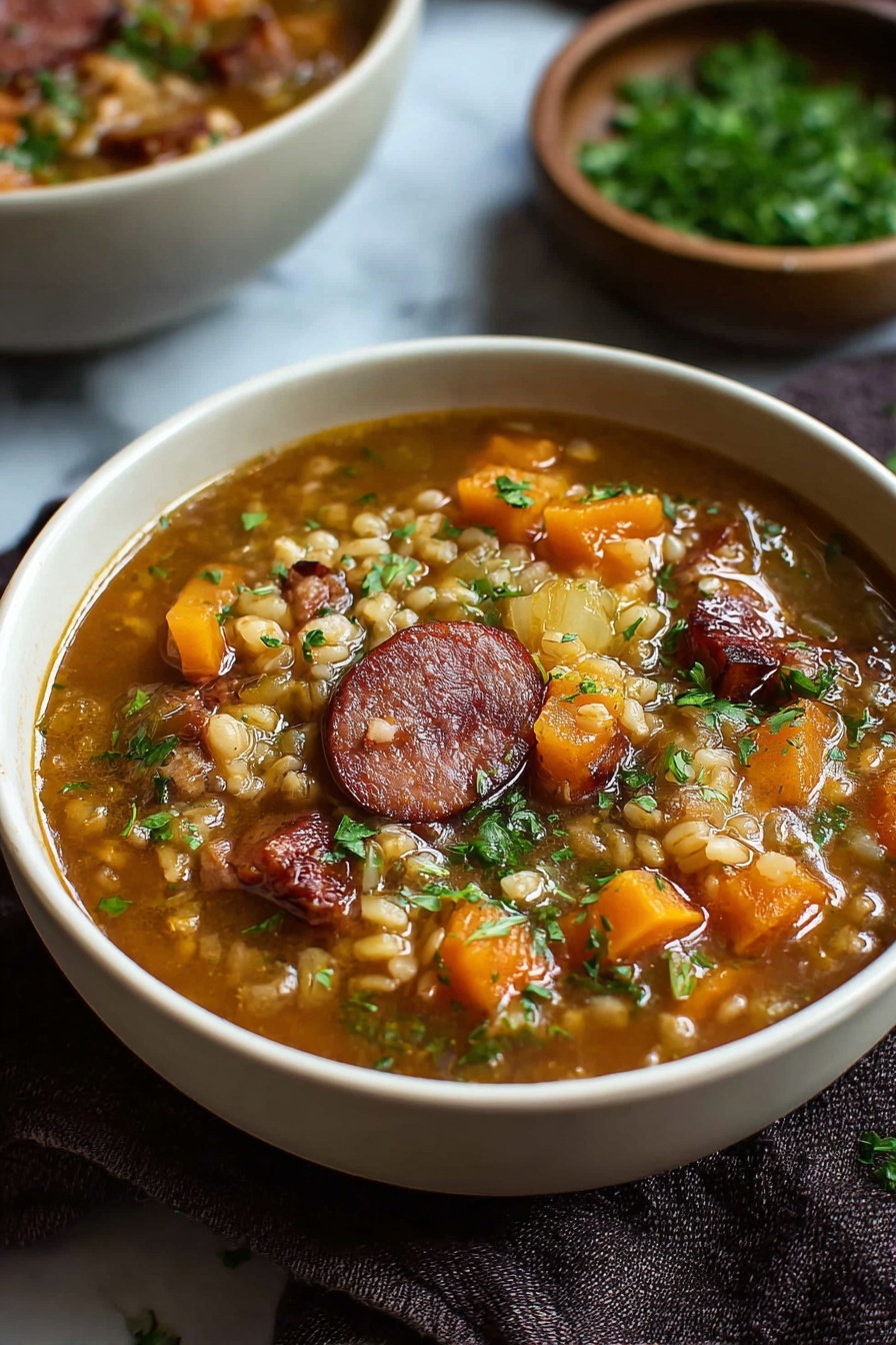 This hearty Kielbasa Barley Soup combines smoky kielbasa sausage with tender pearl barley and a medley of vegetables in a savory beef broth. Perfect for a comforting meal, this soup is simmered to meld flavors and garnished with fresh parsley for a burst of color and freshness.