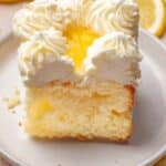 - Assemble the Cake: Place cooled cake on serving plate. Using a wooden stick, poke holes evenly over the cake surface. Pour whole milk slowly over the cake, allowing it to soak in. Next, pour about 3/4 of the lemon syrup over the cake, letting it absorb fully. Reserve remaining syrup for serving. Transfer chilled lemon curd to a piping bag with a small tip and pipe into the holes of the cake. Pipe mascarpone frosting decoratively atop the cake, alternating with small dots of lemon curd. Sprinkle the top with additional lemon zest. Cut into 16 squares. Drizzle extra lemon syrup on each slice when serving and enjoy!