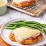 - Add ham and cheese: Remove chicken from the oven and top each piece with a slice of ham followed by Swiss cheese. Return to the oven for 3-5 minutes until cheese is melted and bubbly.