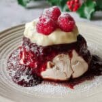 Once your mini pavlovas are completely cool, you’re ready to assemble! Start by spooning a bit of raspberry sauce on top, followed by a drizzle of warm chocolate ganache. Then add a generous dollop of whipped cream, scatter fresh raspberries over the top, and finish with a light dusting of icing sugar. I like to serve this immediately so the chocolate remains gooey and the pavlova crisp.