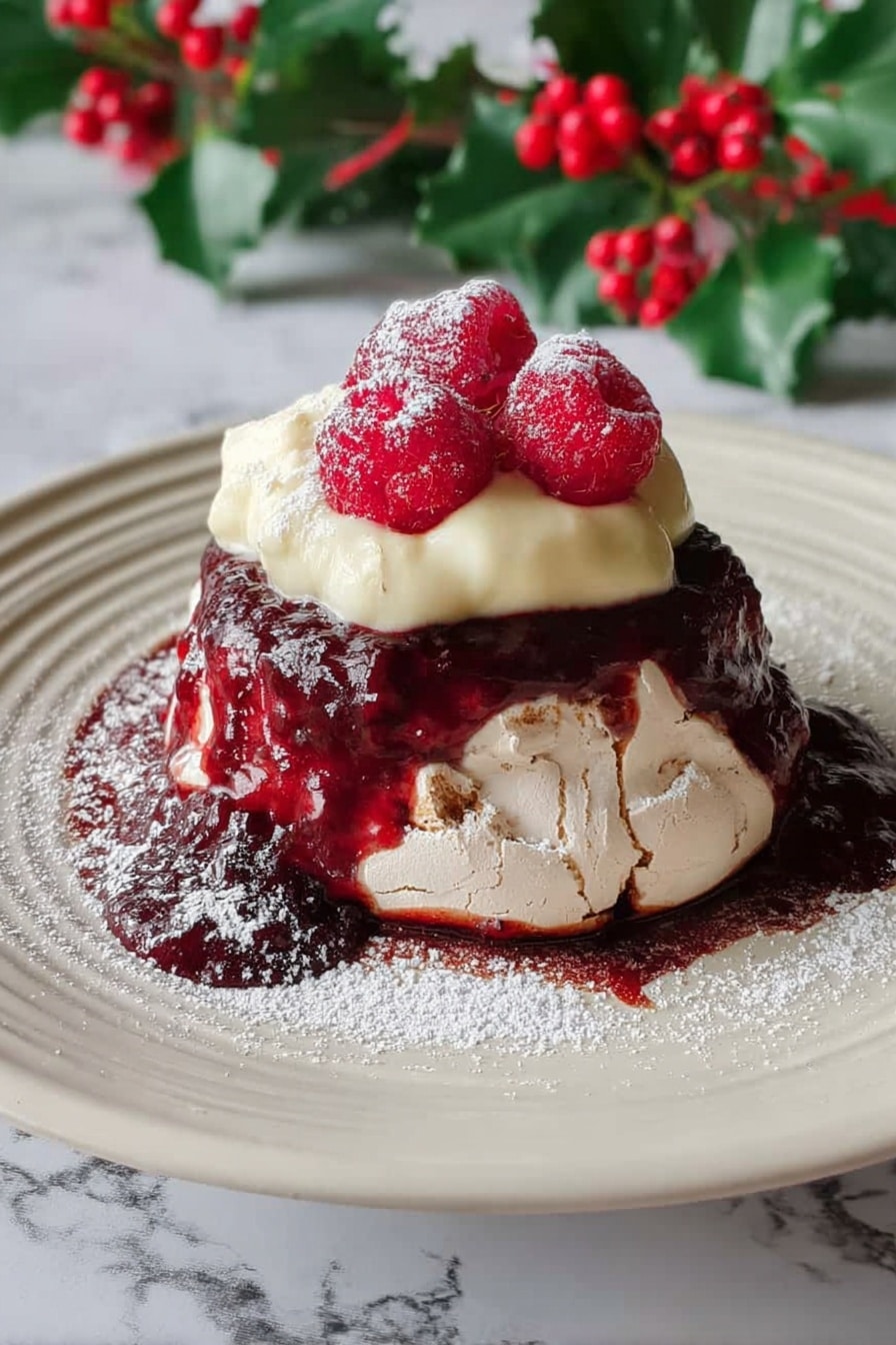 - Assemble and Serve: Top each pavlova with raspberry sauce, warm chocolate ganache, a dollop of whipped cream, fresh raspberries, and a delicate dusting of icing sugar.