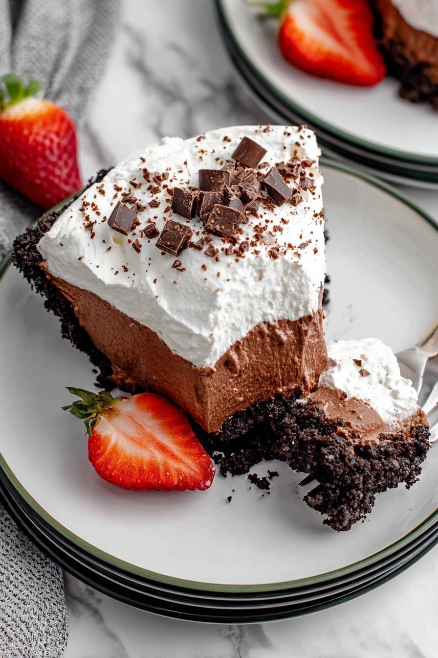 This decadent Mississippi Mud Pie features a rich chocolate sandwich cookie crust, a fudgy brownie layer, a creamy chocolate pudding topping, and a luscious whipped cream finish with chocolate shavings. A multi-layered dessert perfect for chocolate lovers seeking a combination of textures and deep chocolate flavors.
