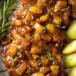 This One Pan Chicken with Apple Cider Sauce is a simple yet elegant dish featuring tender, juicy chicken breasts cooked to perfection in a skillet and topped with a flavorful apple cider sauce. The sauce, enriched with diced Granny Smith apples, shallots, Dijon mustard, and brown sugar, offers a delightful balance of savory and sweet, complemented by fresh rosemary garnish. Perfect for a quick weeknight dinner or a cozy weekend meal.