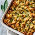 For special occasions, I like to bake the stuffing in a pretty ceramic dish and top it with fresh rosemary sprigs or edible flowers to make it feel festive. Sometimes I portion it into mini ramekins to create charming individual servings that are always a hit at parties.