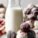 - Repeat drizzle on remaining truffles: Drizzle white chocolate over the milk chocolate dipped truffles and sprinkle with crushed peppermints as well.