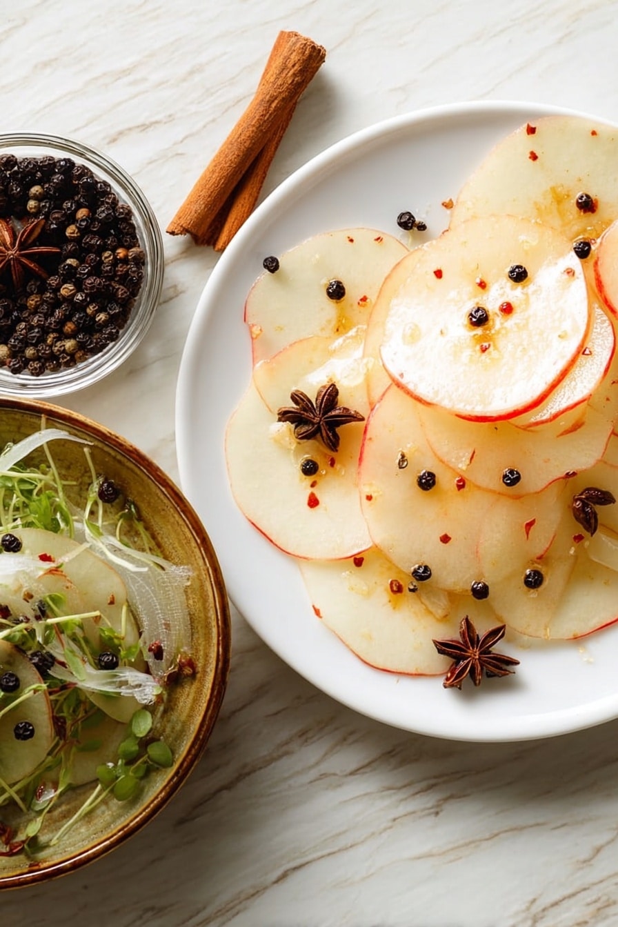 A vibrant and tangy Pickled Apples recipe featuring thinly sliced apples soaked in a spiced honey and white wine vinegar brine. This recipe blends warm spices like star anise, cardamom, cinnamon, and allspice to create a perfect balance of sweet, tart, and aromatic flavors, ideal for adding a zesty crunch to salads, cheese boards, or sandwiches.