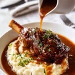 This Port Braised Lamb Shanks recipe features tender lamb shanks slowly cooked in a rich sauce made with port, red wine, beef broth, and aromatic vegetables. The lamb becomes melt-in-your-mouth soft as it simmers over low heat for hours, locked in a deep and flavorful sauce thickened to a comforting syrup consistency. Served with creamy mashed potatoes and garnished with fresh parsley, this dish is perfect for a special occasion or cozy dinner.