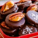 These Pretzel Turtles are a delightful combination of salty pretzels, roasted pecans, gooey caramel, and rich semi-sweet chocolate, topped off with a sprinkle of fleur de sel. Perfect as a sweet and salty treat for any occasion, they are easy to assemble and sure to impress.