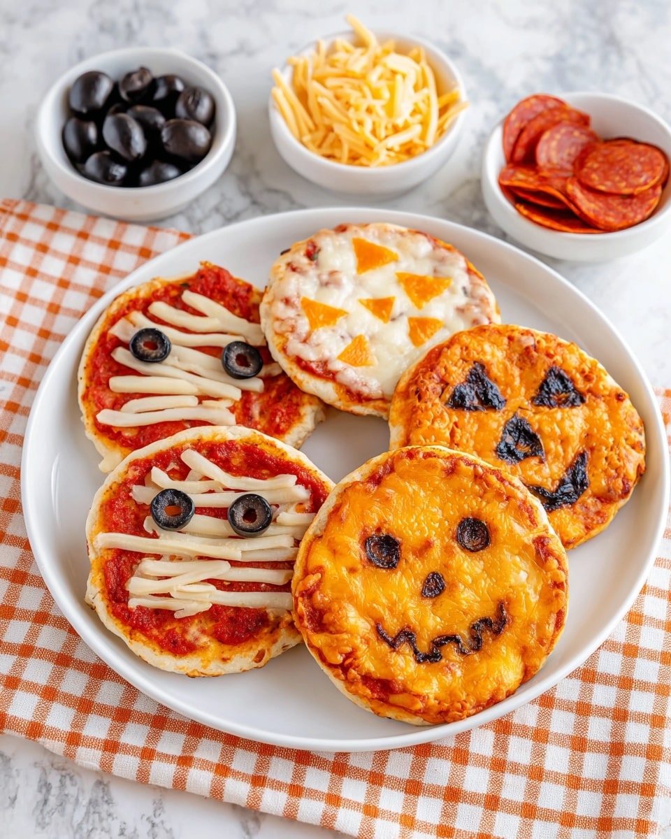 - Decorate with Toppings: Use shredded cheddar or mozzarella cheese to represent the orange pumpkin body. Arrange sliced black olives, basil, and additional toppings creatively to form jack-o’-lantern faces or other pumpkin decorations on each pizza.