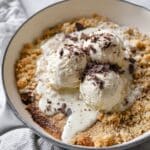 The moment you’ve been waiting for! Serve this warm Pumpkin Skillet Cobbler with a generous scoop of vanilla or cinnamon ice cream. I sprinkle chopped chocolate on top for a decadent touch. A dusting of cinnamon or extra pumpkin pie spice is also lovely. The combination of warm, spiced pumpkin with cold, melting ice cream is absolutely heavenly.