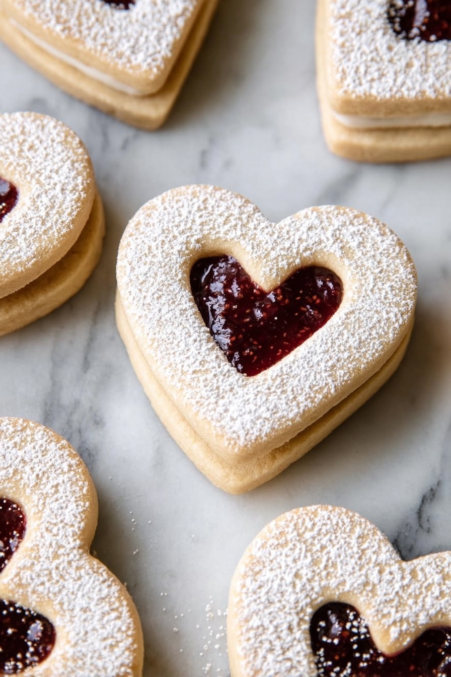 - Sandwich Cookies: Carefully place the sugar-dusted cut-out top cookies onto the jam-covered bottoms, aligning them gently to avoid smudging. If desired, fill the open centers with additional jam for extra flavor and a pretty presentation.