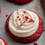 - Frost and Decorate Cookies: Transfer the frosting to a piping bag fitted with a large round tip or a ziplock bag with the corner cut off. Pipe the frosting onto each cooled cookie and sprinkle with the red velvet cookie crumbs prepared earlier. Serve and enjoy!