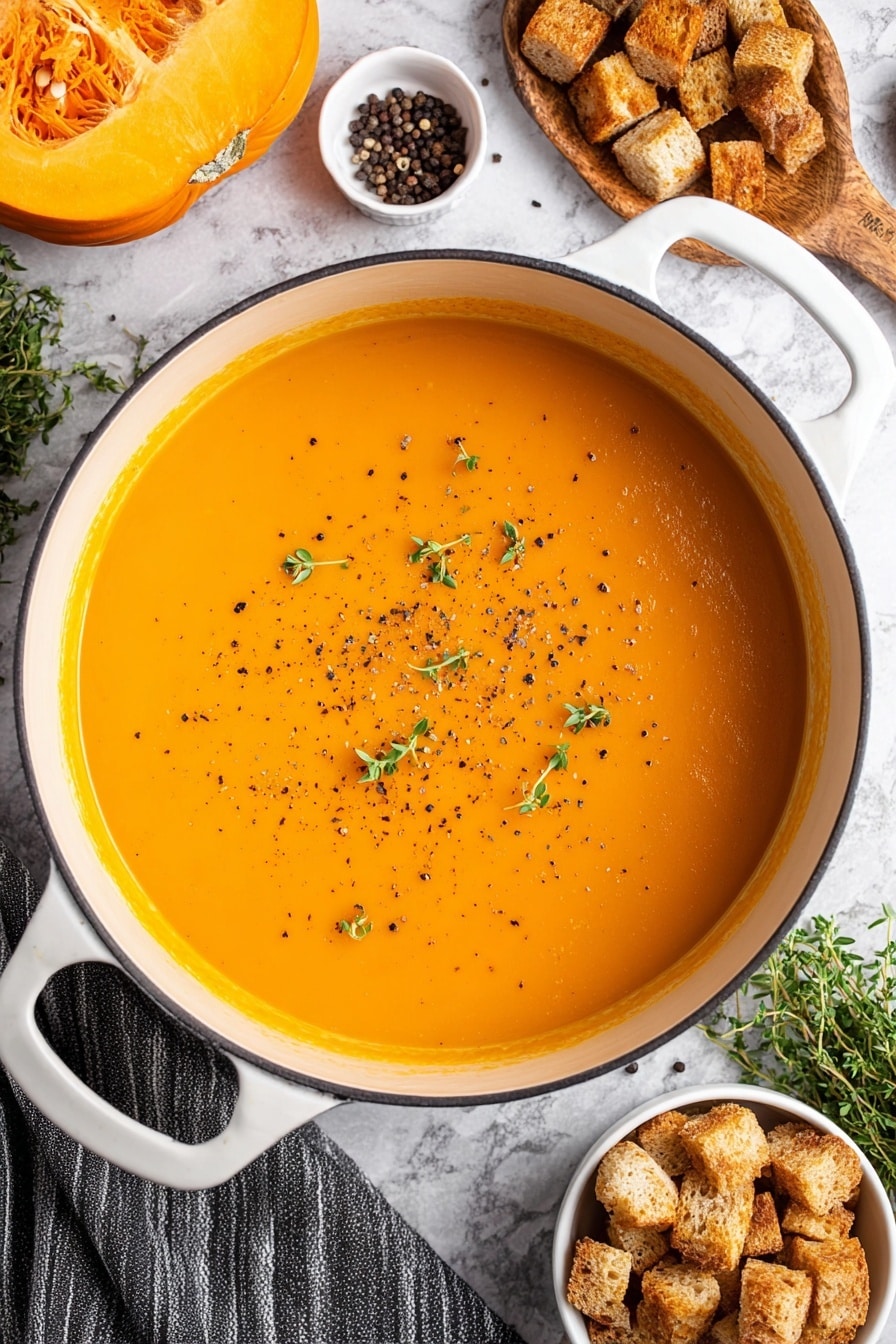 This Roasted Butternut Squash Soup is a creamy, comforting dish packed with roasted vegetables and warm spices. Perfect for chilly days, the roasting process enhances the natural sweetness of the squash and carrots, while fresh thyme and a hint of cayenne add depth and subtle heat. The soup is blended to a smooth consistency and can be topped with crunchy bread croutons for added texture.