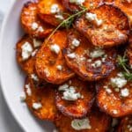 This delicious recipe features roasted sweet potato rounds perfectly seasoned with a blend of warm spices and drizzled with honey for a touch of sweetness. Topped with crumbled feta and fresh herbs, these sweet potato slices make a delightful, crispy, and flavorful side dish or appetizer that’s easy to prepare and sure to impress.