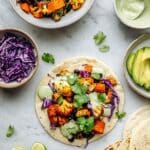 These Sheet Pan Roasted Veggie Tacos are a vibrant, flavorful, and healthy meal option featuring roasted cauliflower, sweet potatoes, bell peppers, and black beans seasoned with a warm blend of spices. Perfectly charred tortillas, creamy avocado, and your choice of jalapeno cashew cream or cilantro yogurt sauce complete these easy-to-make tacos that serve 4 people with two tacos each.