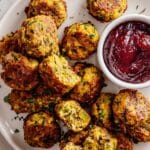 Once your sausage stuffing bites are out of the oven, transfer them to a serving platter, sprinkle with fresh parsley for color, and set out the cranberry sauce on the side. Everyone loves dipping these little balls into that sweet-tart sauce. I promise you’ll be reaching for seconds!