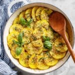 This Sautéed Yellow Squash recipe offers a simple, flavorful way to prepare squash using a light herb oil and a crunchy vegan breadcrumb topping. The yellow squash is sliced and quickly sautéed to maintain a tender yet firm texture, then tossed in a zesty herb oil and topped with a savory mixture of panko breadcrumbs, vegan Parmesan, and fresh herbs. It’s a quick, healthy side dish perfect for any meal.