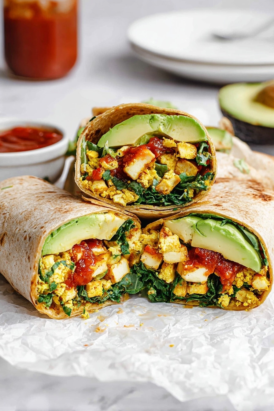 - Assemble burritos: Warm tortillas if desired. Place a portion of the tofu scramble on each tortilla. Top with salsa and optional avocado slices.