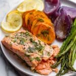 For special occasions, I’ve served the salmon and veggies over a bed of fluffy couscous or alongside roasted baby potatoes for a heartier presentation. Laying multiple lemon slices across the top of the salmon before baking makes for an impressive, bright visual too!