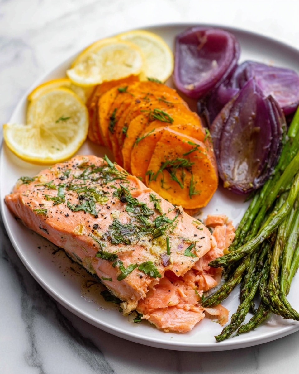 - Serve: Serve the salmon and vegetables warm, garnished with extra lemon slices and season with salt and pepper if preferred.