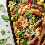 This Sheet Pan Gnocchi with Kielbasa and Vegetables is a quick and easy one-pan meal featuring crispy gnocchi, savory smoked kielbasa, colorful bell peppers, red onion, and sweet cherry tomatoes. Topped with fresh spinach, fragrant herbs, and Parmesan cheese, it’s a flavorful and comforting dish perfect for busy weeknights.