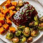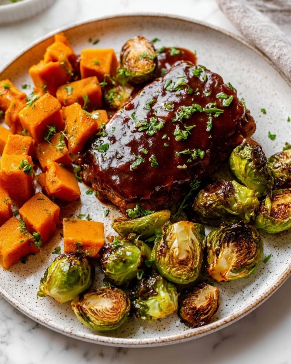 Once the meatloaves are cooked through, take the pan out and sprinkle chopped fresh parsley over everything if you like that pop of fresh green. Serve right off the pan while everything’s hot, savory, and perfectly roasted. I love the harmony of sweet potatoes’ natural sweetness with the savory meat and earthy Brussels sprouts.