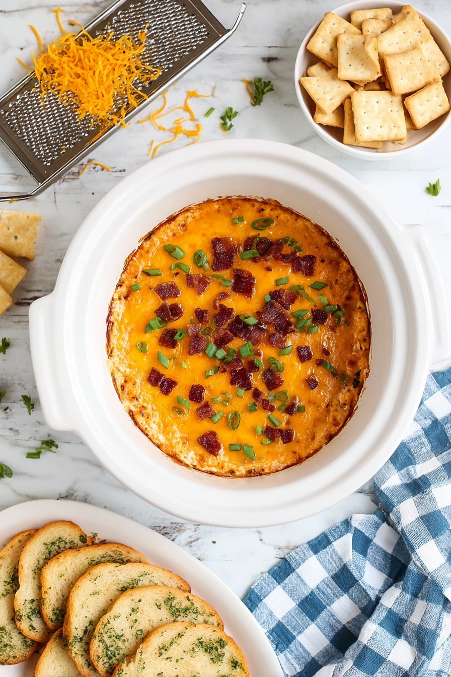 Once cooked, sprinkle the top with the remaining cooked bacon slices and chopped green onions if you like. This adds a pop of color and an extra layer of smoky goodness. Serve it warm with garlic bread or your favorite crackers—both work beautifully for scooping up every last bit.