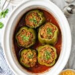 - Stuff the Peppers: Fill each hollowed-out bell pepper with the prepared beef and rice mixture. If there is any leftover filling, place it at the bottom of the slow cooker to cook along with the peppers.